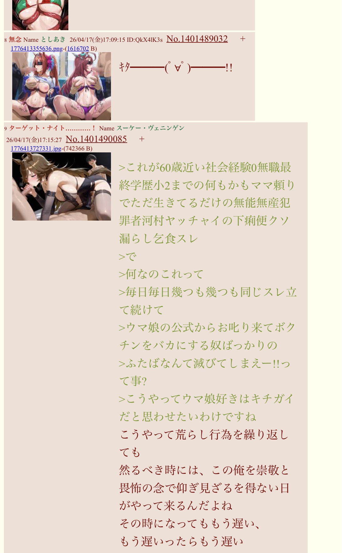 | … | 4無念Nameとしあき26/04/20(月)08:48:25 ID:vVAA0F.ENo.1402158653そうだねx2気持ち悪いのでdelします |