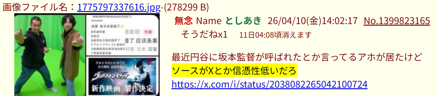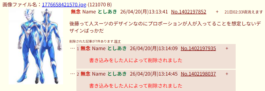| … | 13無念Nameとしあき26/04/20(月)13:19:50No.1402198819そうだねx4>特撮掲示板のウルトラマンファンの人達 |