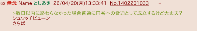 | … | 64無念Nameとしあき26/04/20(月)13:34:09No.1402201111+>>数日以内に終わらなかった場合普通に円谷への脅迫として成立するけど大丈夫? |