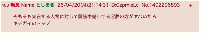 | … | 79無念Nameとしあき26/04/20(月)21:56:13No.1402307572+>生涯をかけてホモ男優に誹謗中傷してる奴なんてクズ以外のなにものでもないだろ |