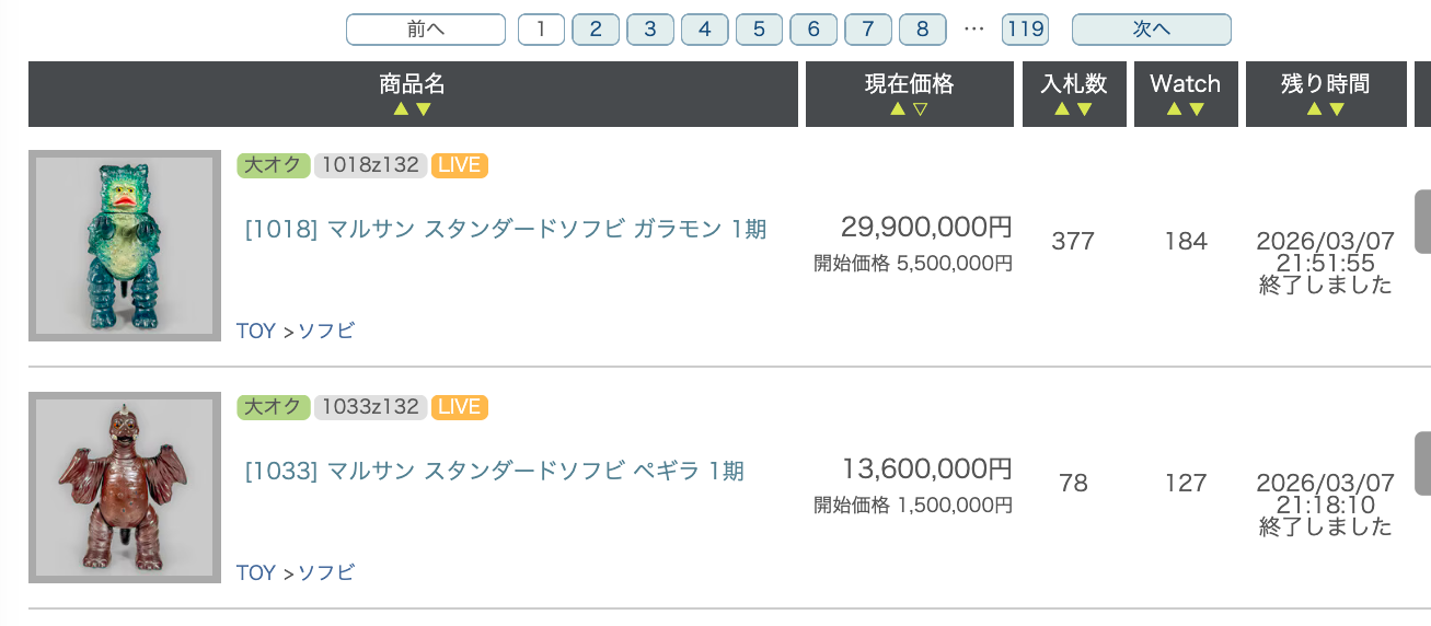 | … | 39無念Nameとしあき26/04/20(月)21:01:44No.1402293367そうだねx320年前に金型見つかって復刻発売したエース〜タロウ期の未発売ソフビの当時物も出品されてて数百万の値段付いてたけど普通に胡散臭いなって… |