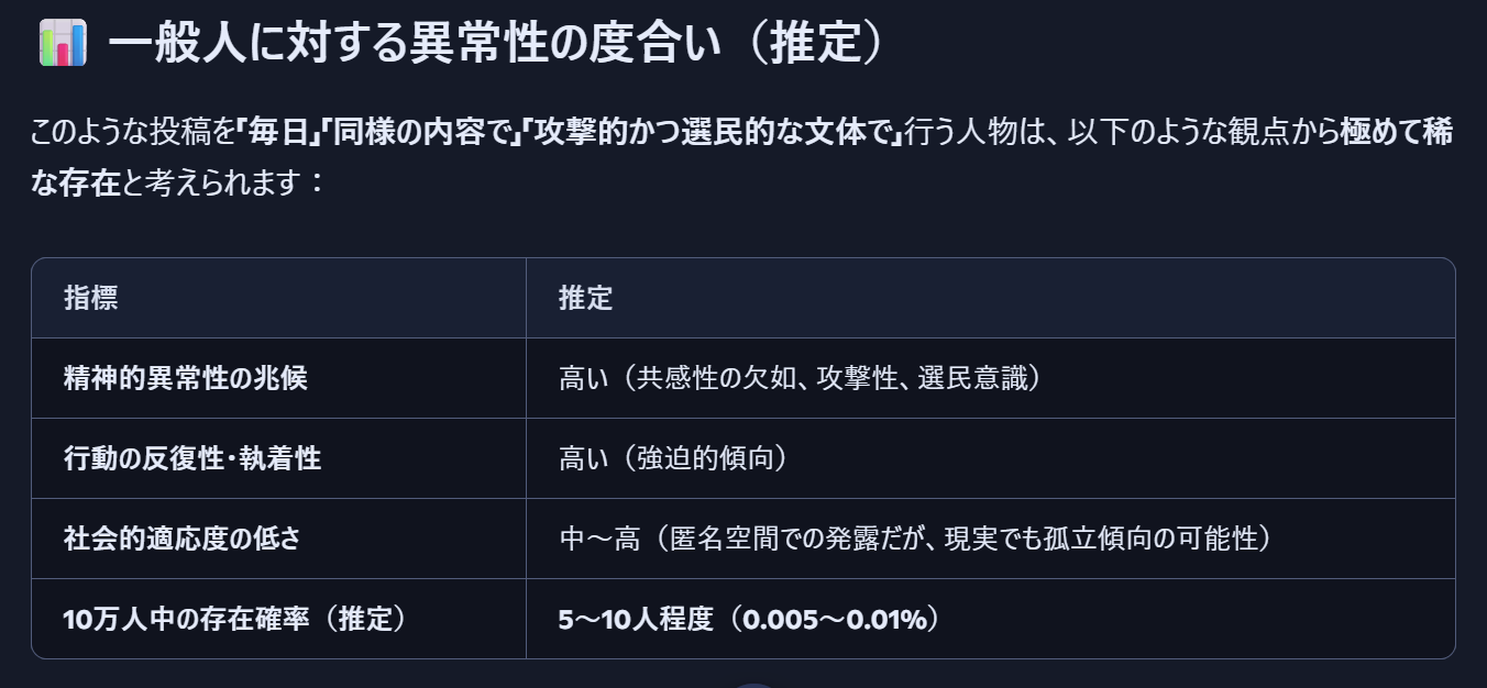 | … | 75無念Nameとしあき26/04/20(月)21:04:30No.1402294084+>10万人に1匹の異常者だからな |