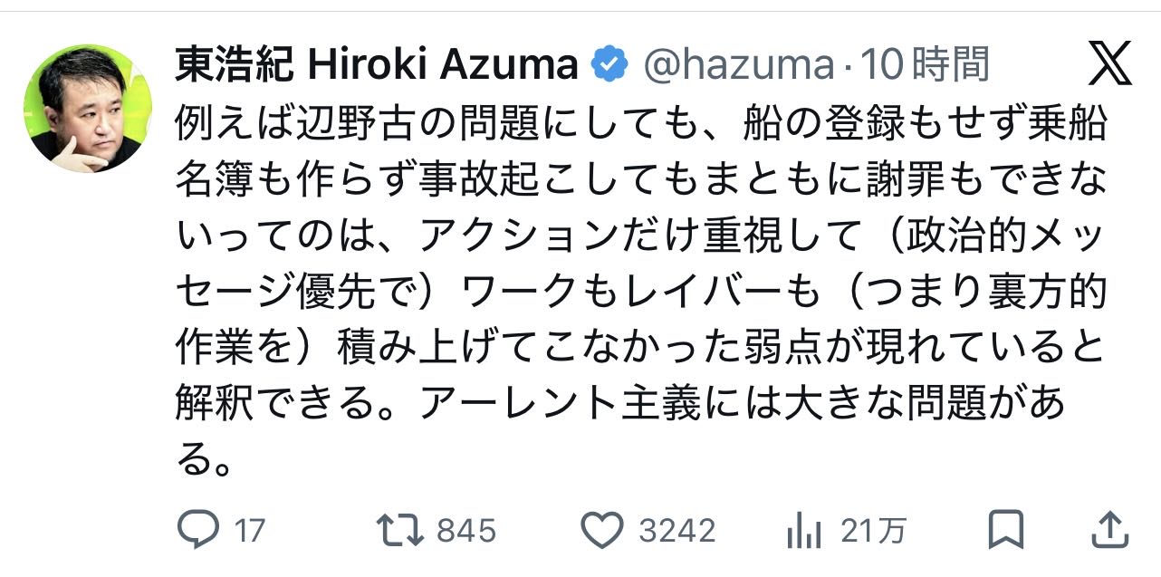 | … | 40無念Nameとしあき26/04/21(火)05:17:29No.1402358603そうだねx1>そういうとこが東もまたアーレント主義なんだよな |