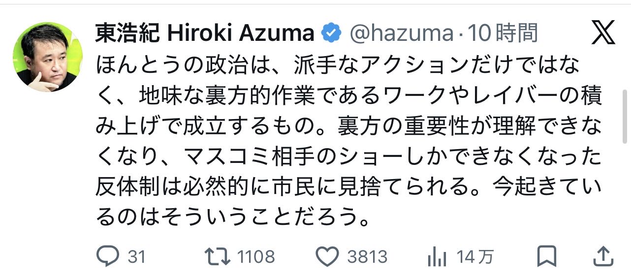 | … | 37無念Nameとしあき26/04/21(火)04:09:28No.1402356752そうだねx1アーレント主義って政治『批判』に於ける立場であって、日本の左翼云々はアーレント主義が適用される立場にはない気がする |