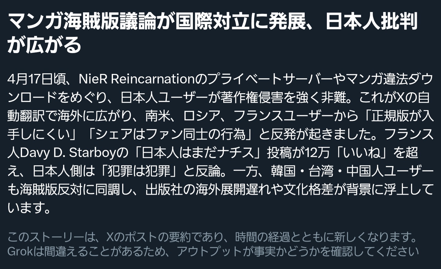 | … | 117無念Nameとしあき26/04/21(火)09:00:45No.1402375344+海賊版騒動は日本人のダブスタっぷりを世界中に晒す羽目になったな |