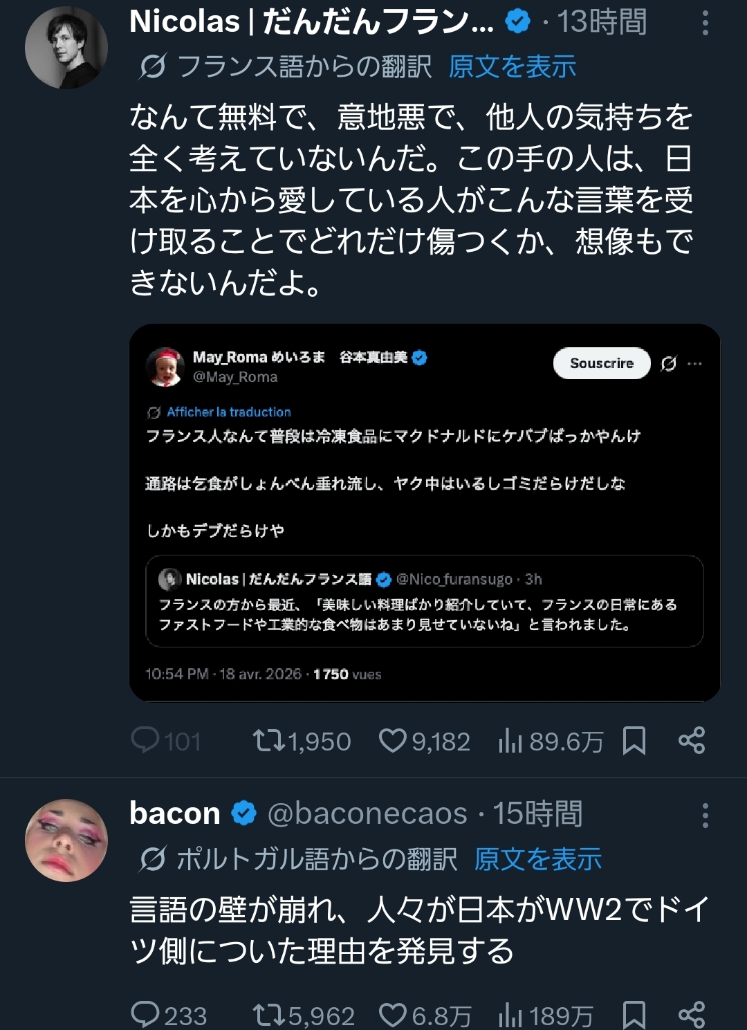 | … | 93無念Nameとしあき26/04/21(火)08:51:19No.1402374227+ 1776729079314.jpg-(339285 B) >Xの自動翻訳機能のおかげで日本人の普段の言動が世界中にバレた結果日本人をオチに持ってくるジョークが世界的に流行してるという |