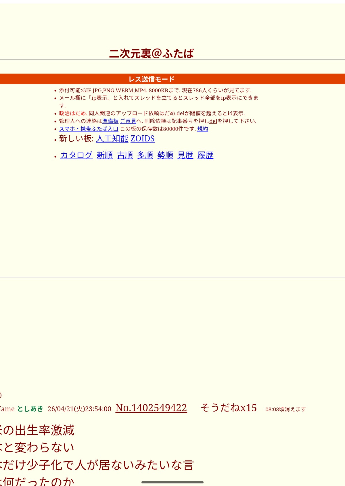 | … | 83無念Nameとしあき26/04/22(水)09:50:30No.1402592400+>最近の二次裏はどうよ? |