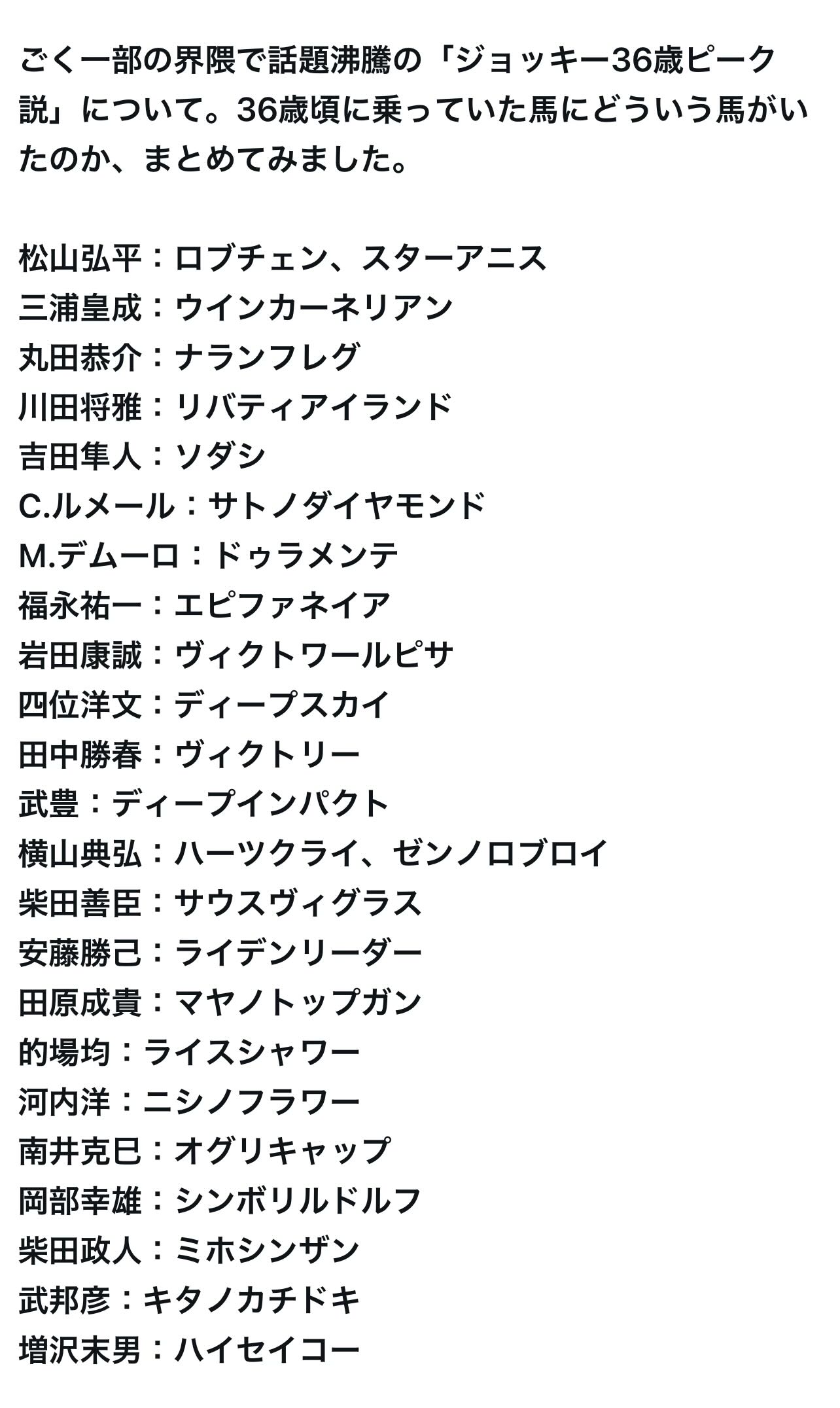 | … | 59無念Nameとしあき26/04/22(水)12:03:31No.1402610739そうだねx4 1776827011686.jpg-(41441 B) >なにやら騎手の36歳ピーク説ってのがまことしなやかに流れてるらしいぽん |
