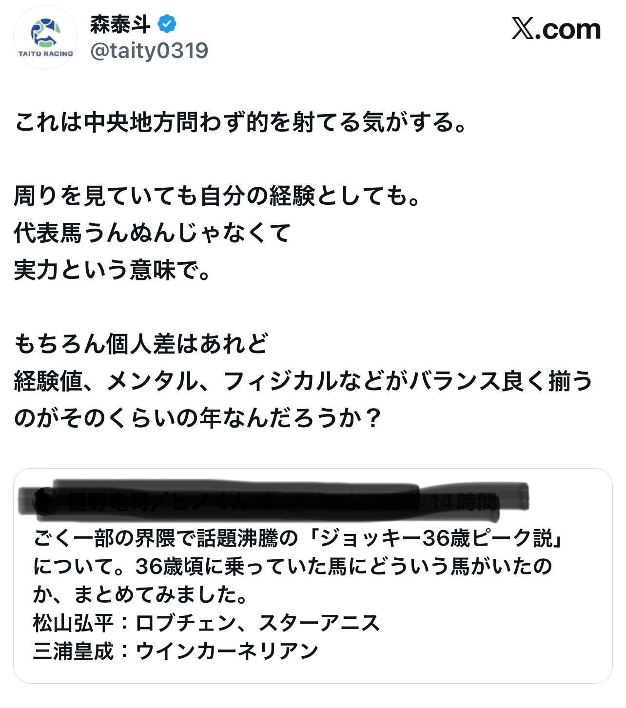 | … | 62無念Nameとしあき26/04/22(水)12:05:04No.1402611009そうだねx4>なにやら騎手の36歳ピーク説ってのがまことしなやかに流れてるらしいぽん |