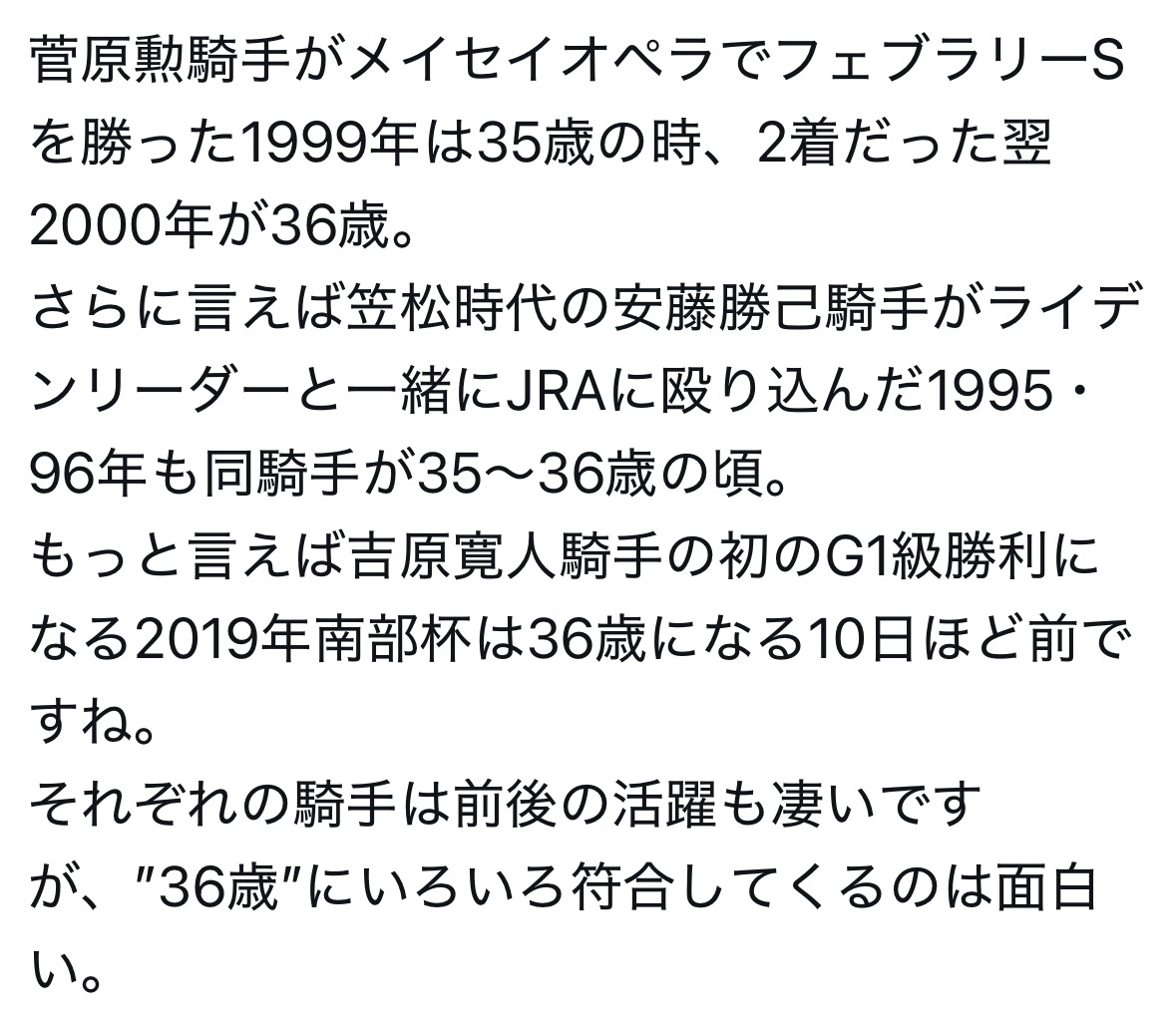 | … | 65無念Nameとしあき26/04/22(水)12:09:35No.1402611841そうだねx5 1776827375618.jpg-(250543 B) >>なにやら騎手の36歳ピーク説ってのがまことしなやかに流れてるらしいぽん |