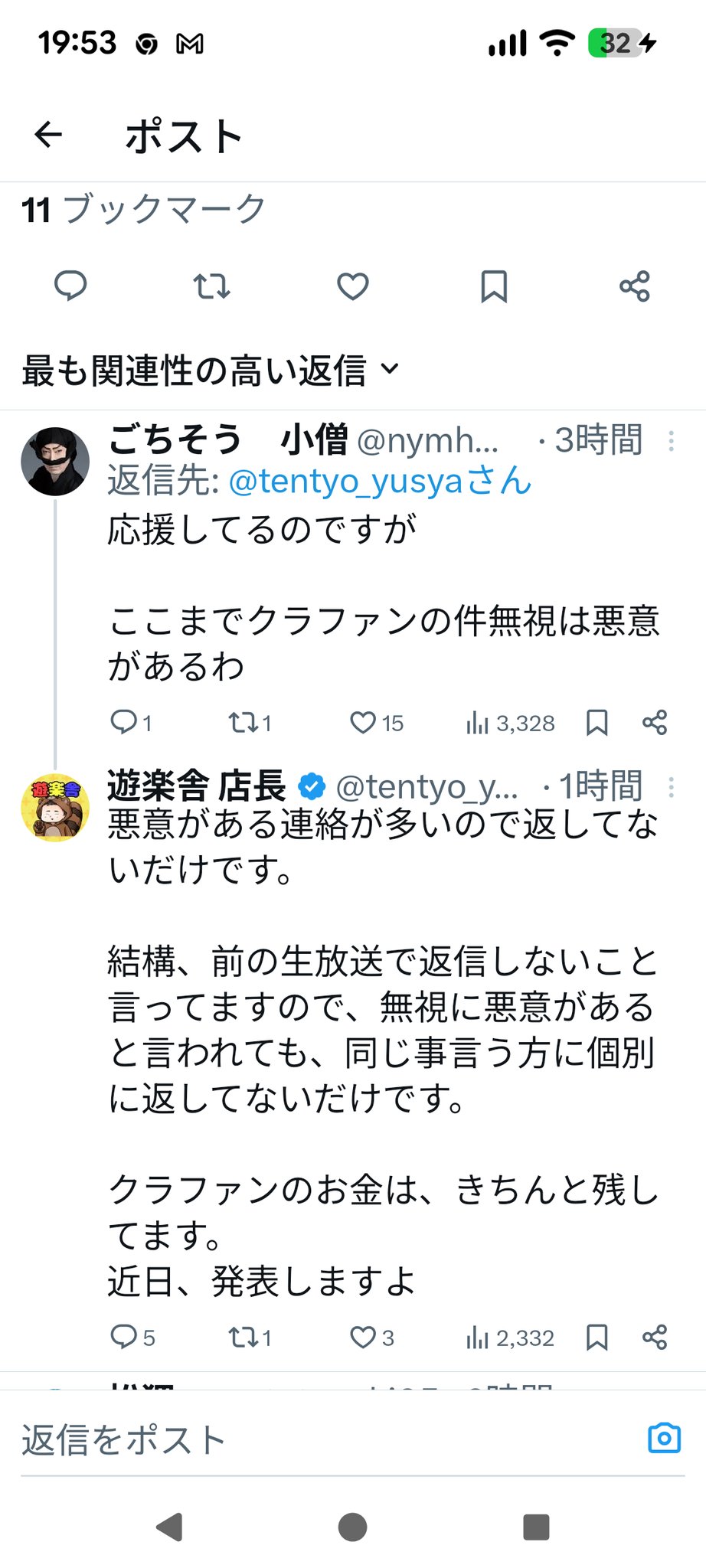 | … | 12無念Nameとしあき26/04/22(水)11:39:32No.1402606987そうだねx1>信者「ここのクソリプの9割はクラファンに参加してない人だろうし今後も遊楽舎に金を落とさない人だろうからシカト決め込むのが最適解だと思う笑」 |