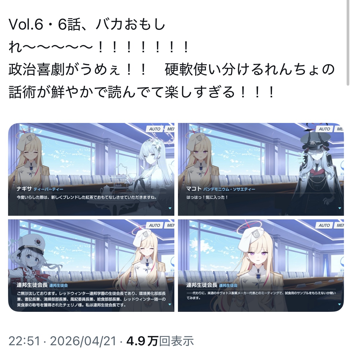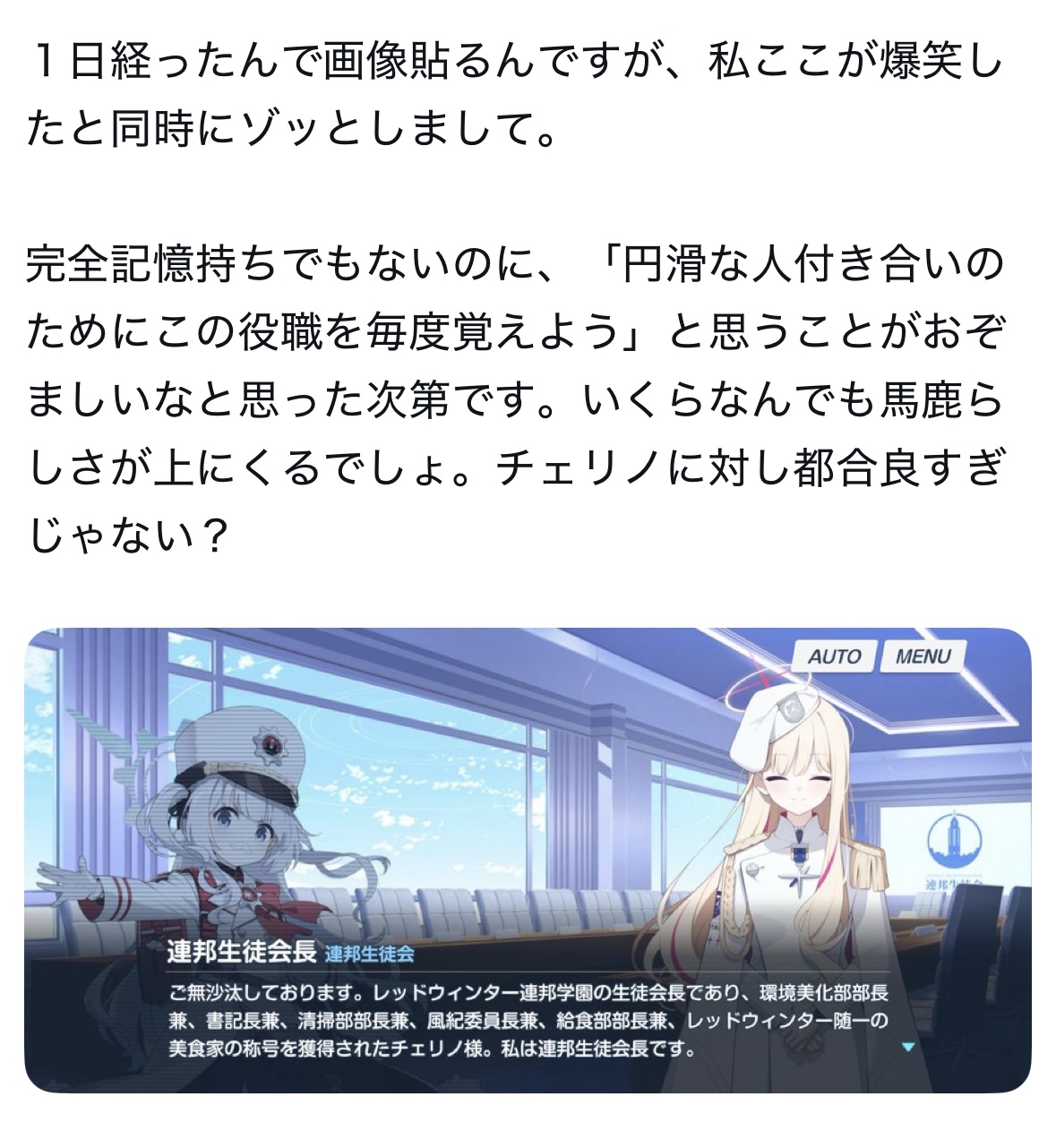 | … | 55無念Nameとしあき26/04/22(水)18:37:26No.1402674725そうだねx4 1776850646113.png-(1675998 B) >真の連邦生徒会長の連邦生徒会長です |