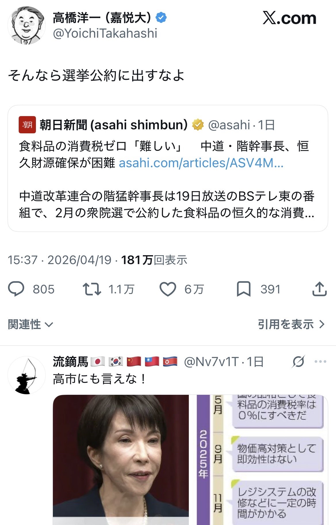 | … | 9無念Nameとしあき26/04/23(木)04:24:20No.1402780248+https://www.youtube.com/watch?v=wS9FAitdxtU 【悲報】「レジが」「イラン情勢が」衆院選公約 食料品消費税ゼロに先送り論!高市首相の発言もブレブレでわざわざ出来ない理由探す【国民会議/消費税減税/給付付き税額控除】 |
