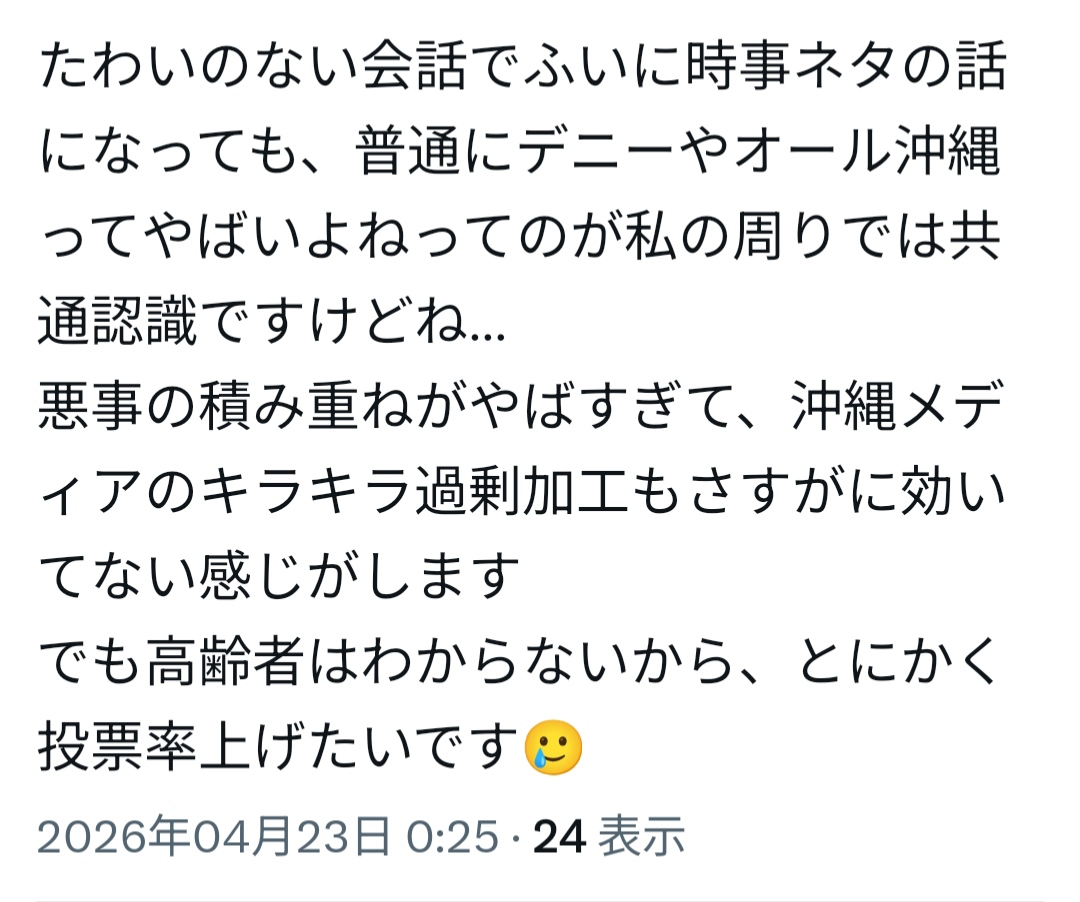 | … | 16無念Nameとしあき26/04/23(木)07:21:09No.1402787463そうだねx1オール沖縄は選挙に向けて住民票を沖縄に移してくれる同胞を募集中って事? |