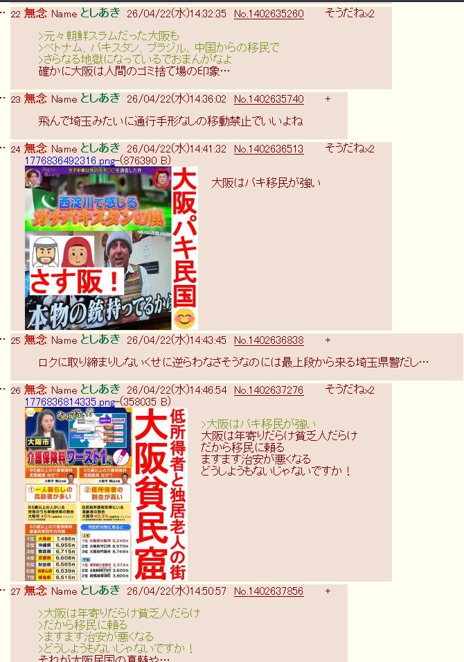 | … | 50無念Nameとしあき26/04/23(木)07:30:48No.1402788322そうだねx5>地域粘着やってる大阪のキチガイだと思うよー |