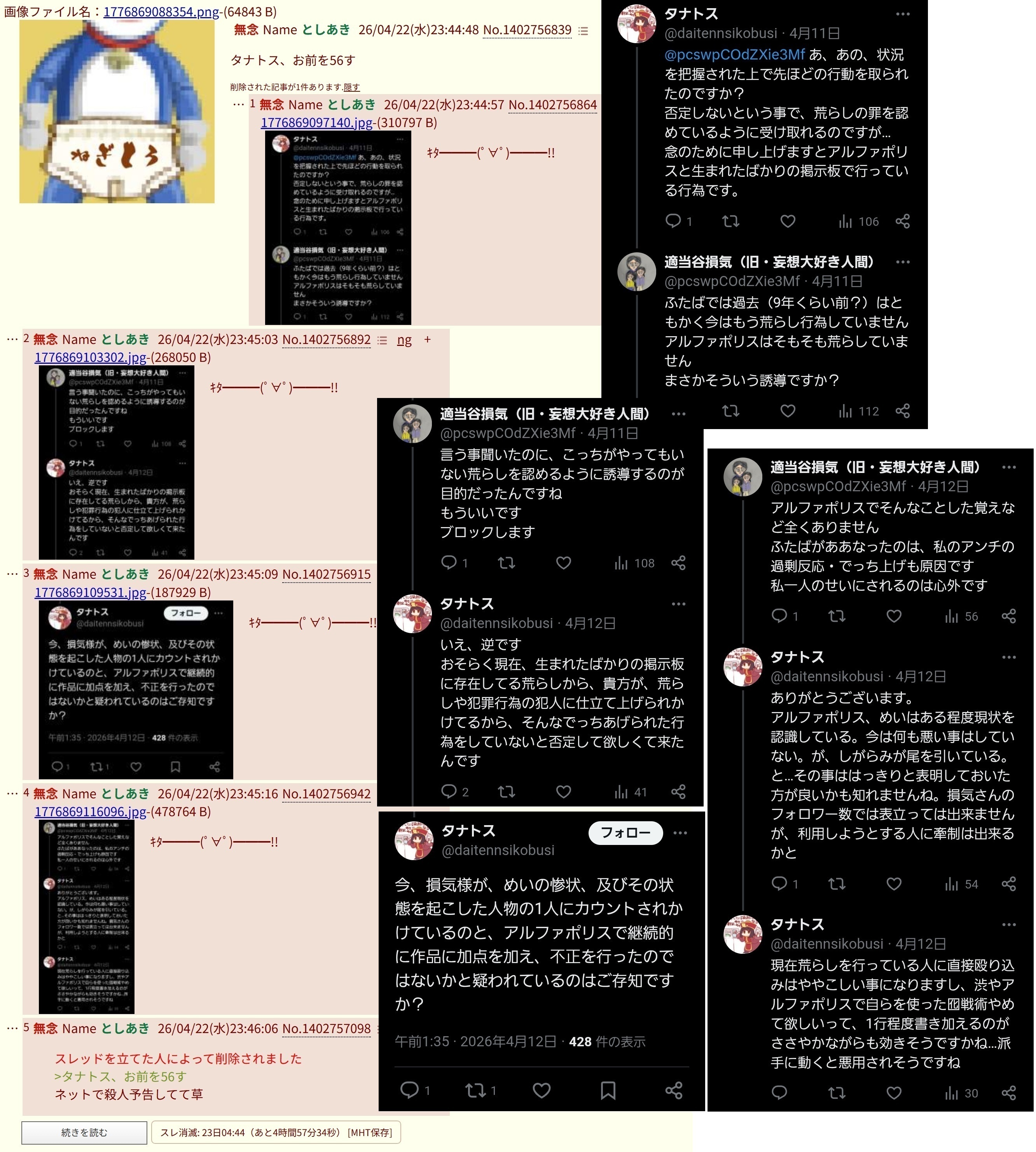 | … | 34無念Nameとしあき26/04/23(木)09:35:01No.1402801935+損気くん何でタナトスって人にアウト予告してんの? |