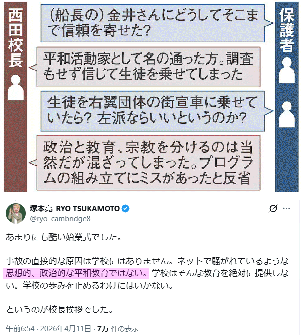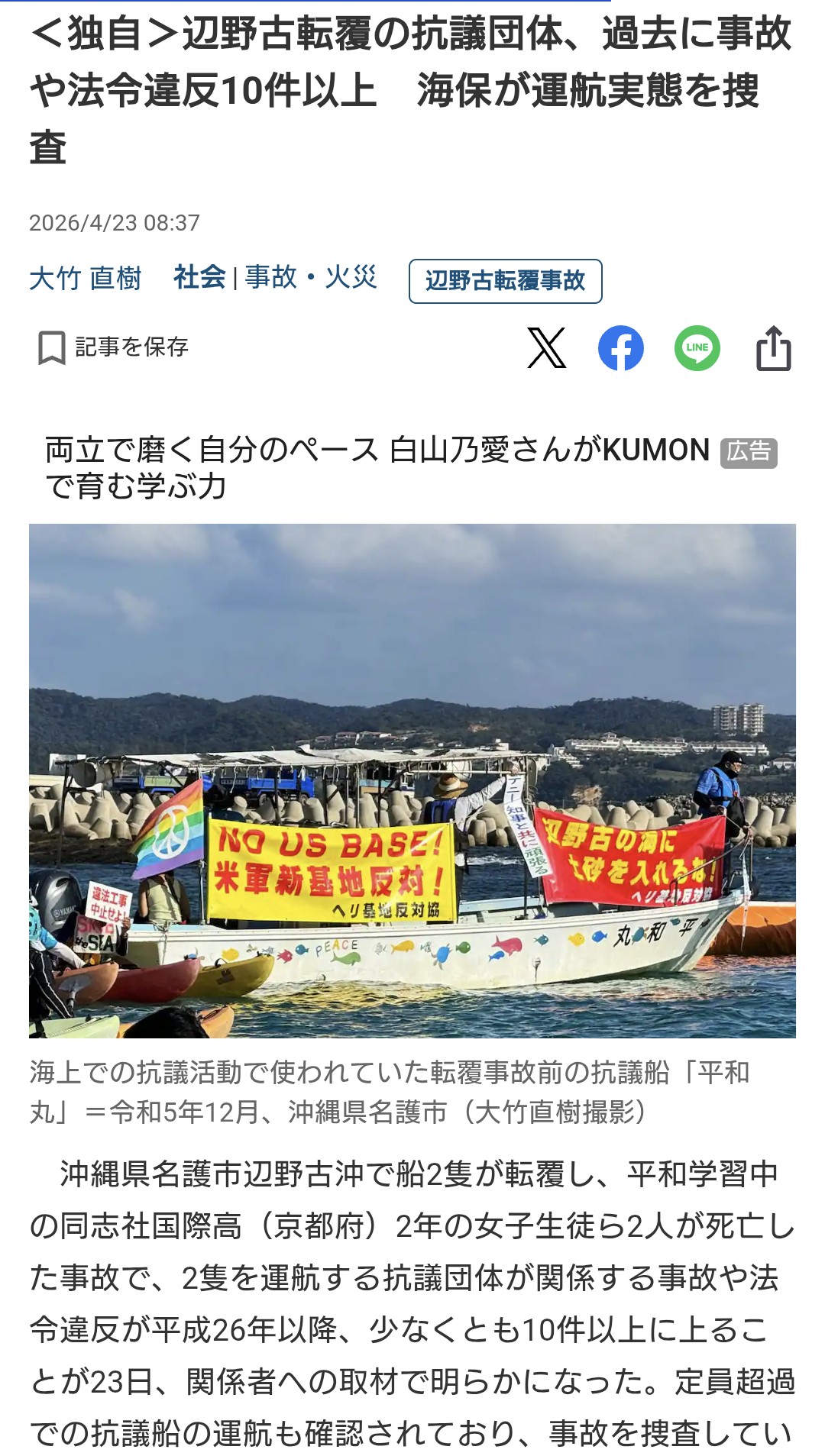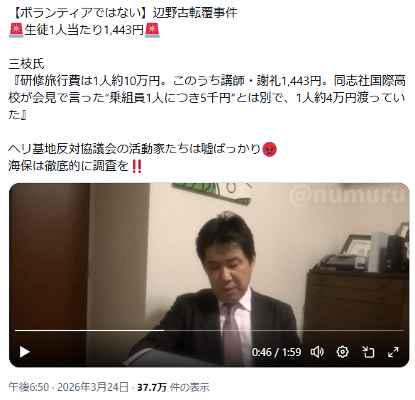 | … | 4無念Nameとしあき26/04/24(金)03:55:46No.1402981365そうだねx34<独自>辺野古転覆「全員船から落とされた」 生徒ら緊迫通報、内容判明 船長ら通報せず |