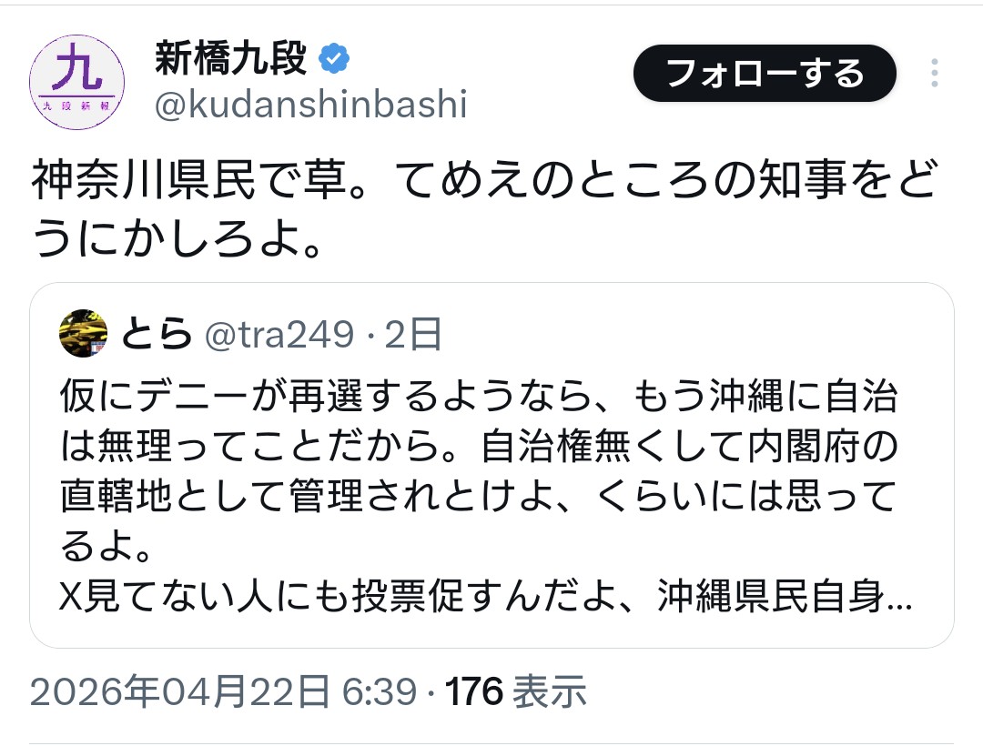 | … | 966無念Nameとしあき26/04/24(金)10:04:51No.1403007138そうだねx3デニーがまた勝ったら沖縄は本当に終わる |