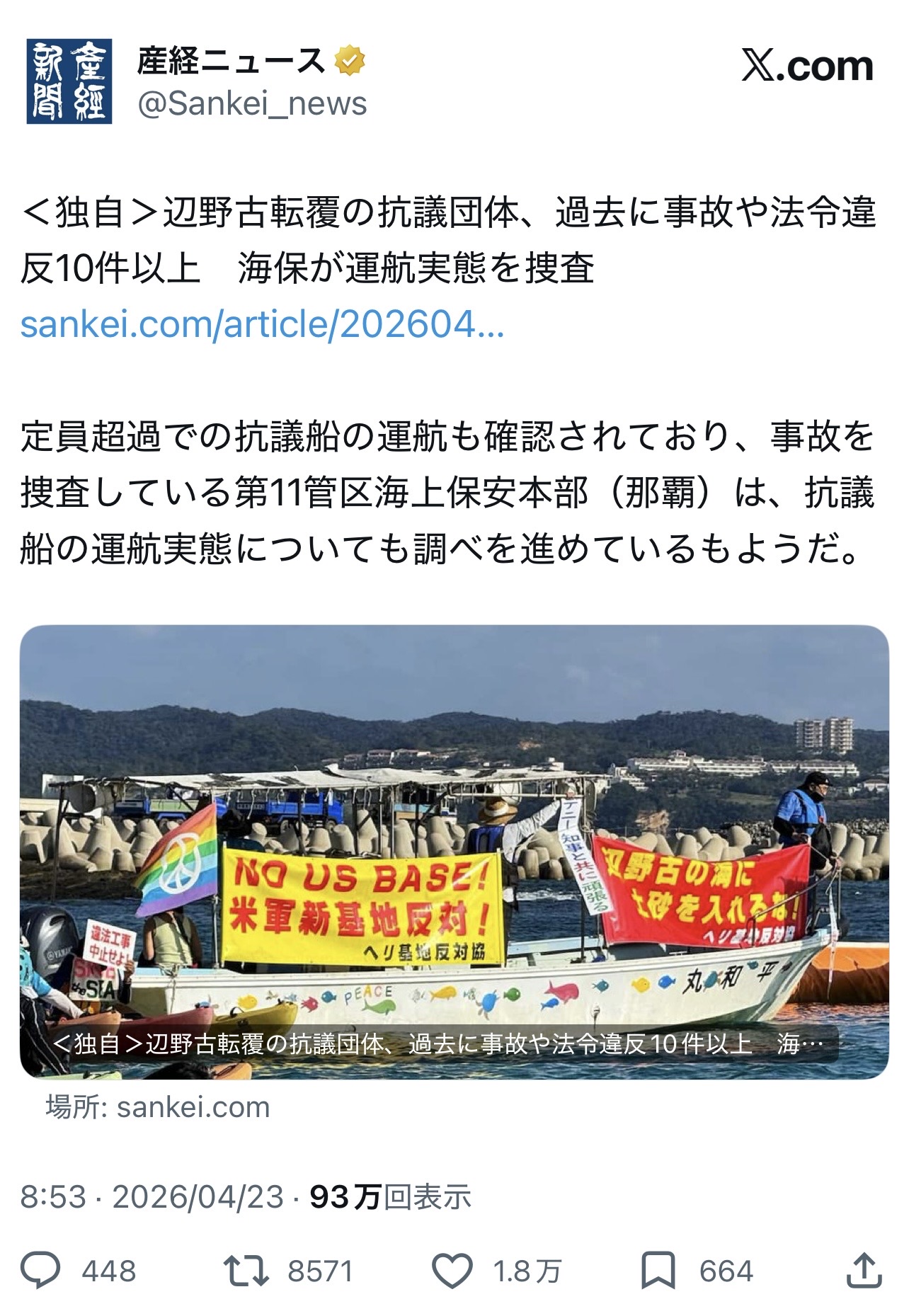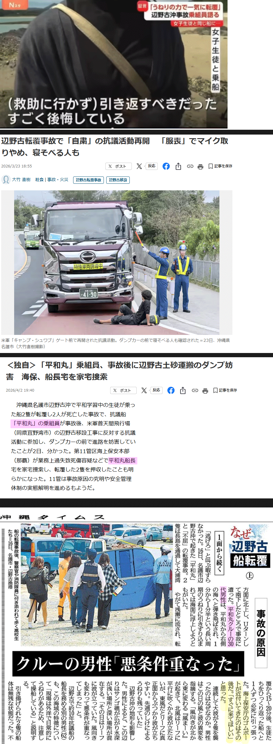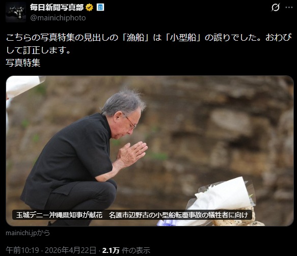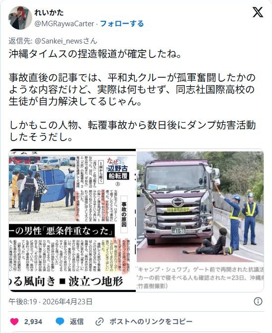 | … | 63無念Nameとしあき26/04/24(金)05:31:41No.1402983790そうだねx4 1776976301339.jpg-(1337651 B) 沖縄タイムスは柴田鉄也の言を利用し海保の救助が遅かったというデマを初期に拡散していたね |