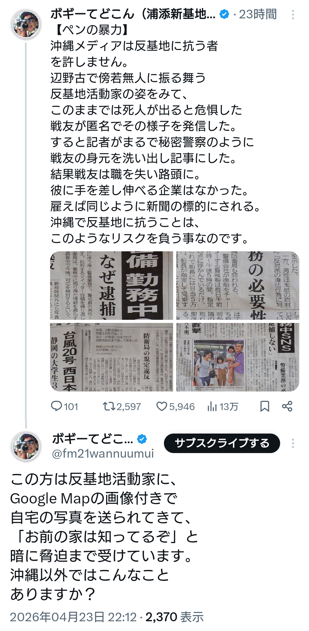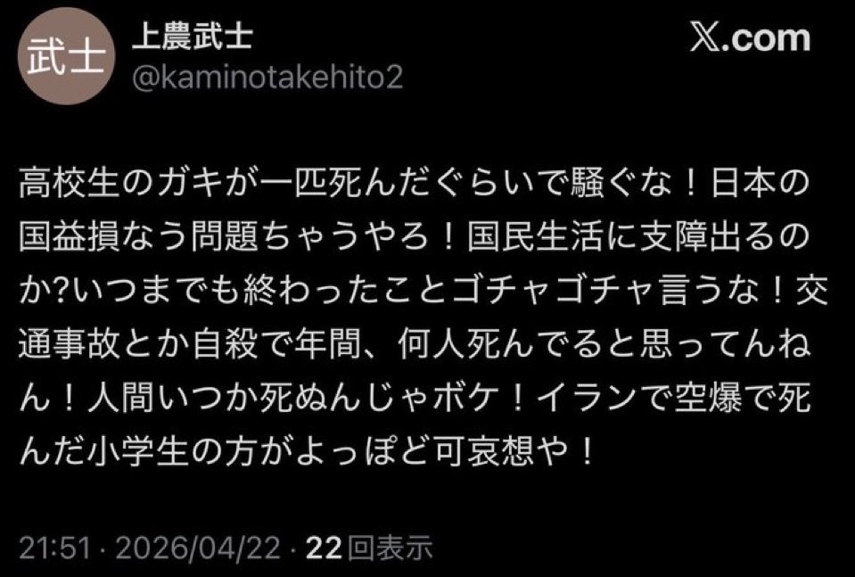| … | 981無念Nameとしあき26/04/24(金)10:12:23No.1403008023+沖縄でこの事件に関するビラ配りでもしたら暗殺されそう |