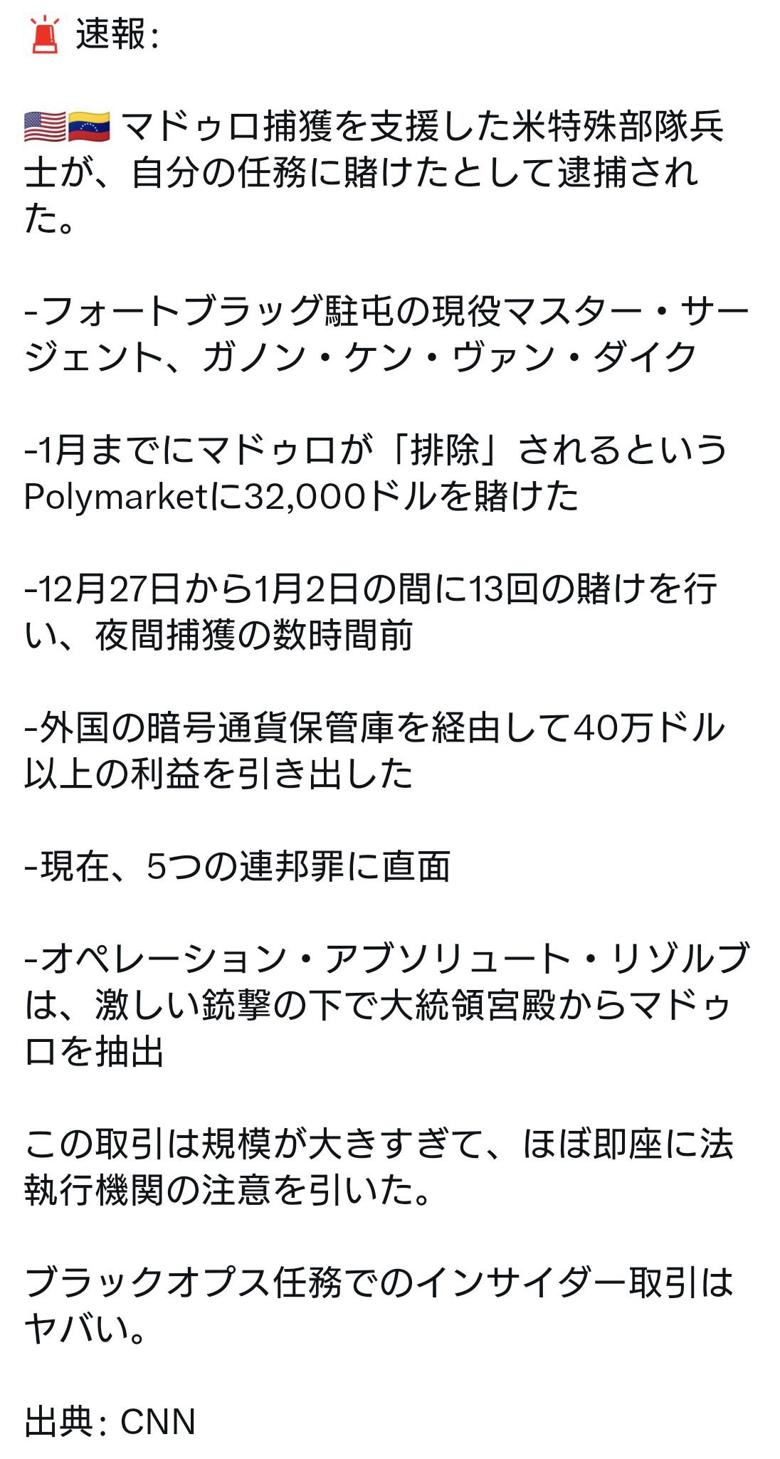 | … | 42無念Nameとしあき26/04/24(金)08:44:23No.1402998468そうだねx3>イランでの戦争を受けて相場が乱高下する中、米政府は、機密情報を用いて金融市場や予測市場で取引することを控えるよう、職員全体に宛てた内部メールで警告した |