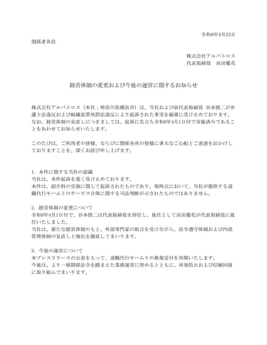 | … | 5無念Nameとしあき26/04/24(金)12:10:39No.1403022867そうだねx3>代表取締役には谷本慎二氏に代わって浜田優花氏が4月1日付で就任 |
