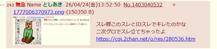 | … | 42無念Nameとしあき26/04/24(金)13:22:42No.1403036229そうだねx6スレ豚はいつも通り虹裏常駐のとしあきから叩かれてるだけでしょ |