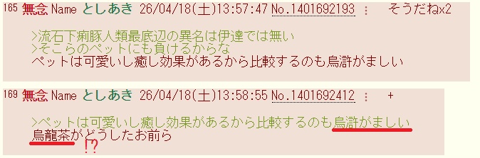 | … | 15無念Nameとしあき26/04/24(金)22:05:42No.1403140380+>烏龍茶から1週間か |