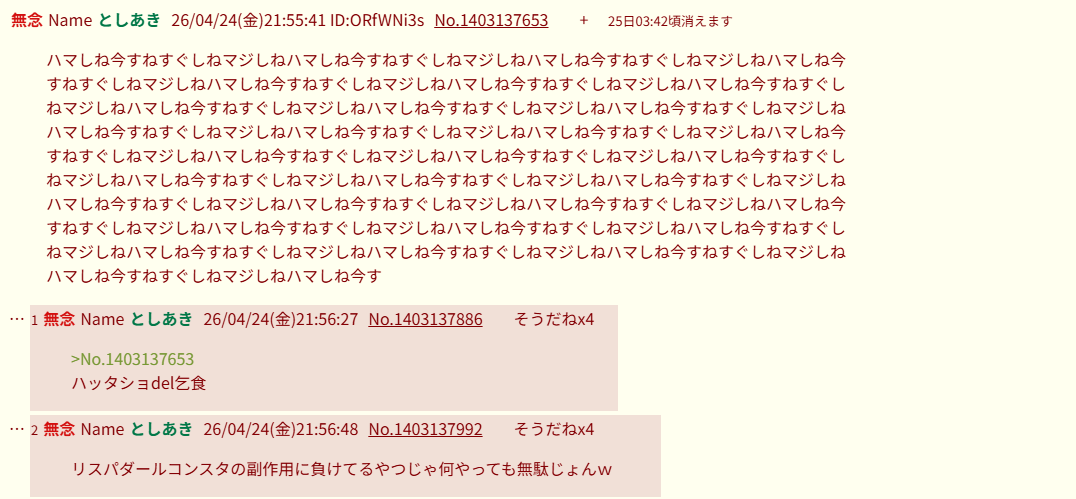 | … | 2無念Nameとしあき26/04/24(金)21:56:48No.1403137992そうだねx6リスパダールコンスタの副作用に負けてるやつじゃ何やっても無駄じょんw |