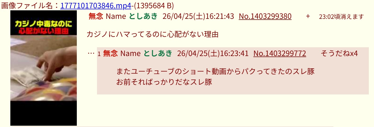 | … | 357無念Nameとしあき26/04/25(土)19:38:34No.1403345976+>そしてソンキの出す脳内人物とか知る価値もない |