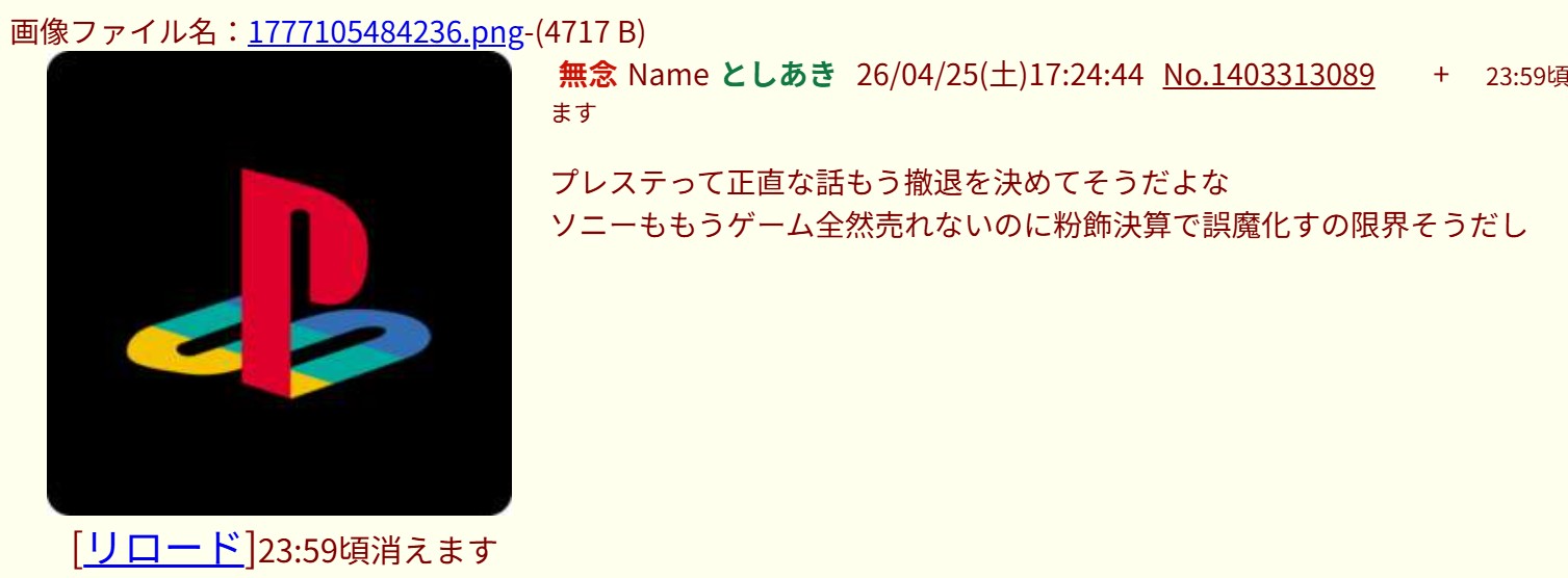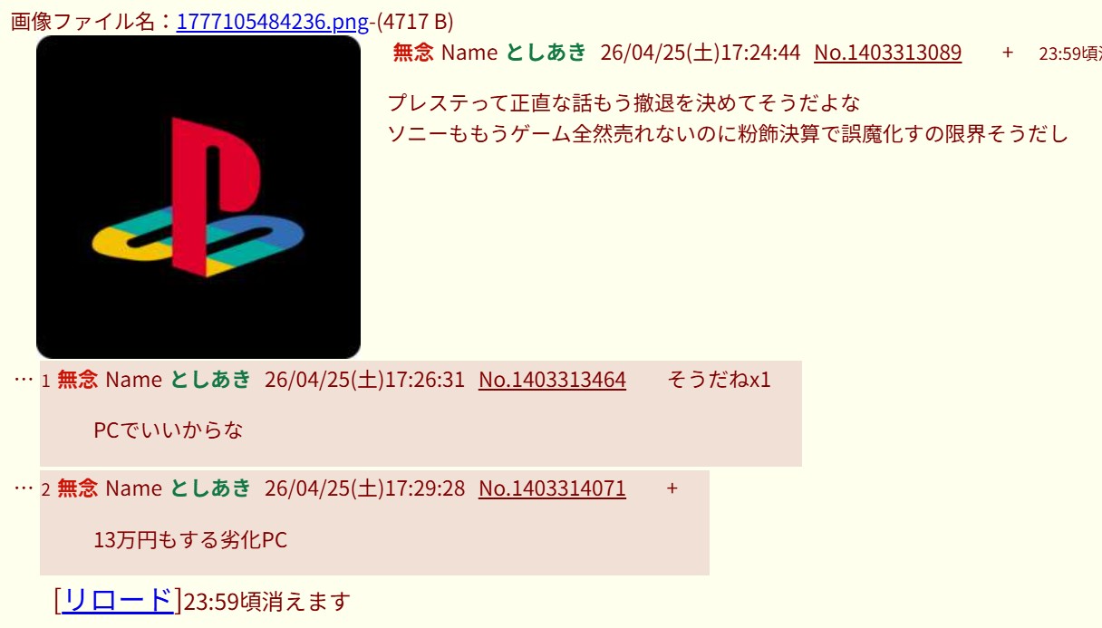 | … | 91無念Nameとしあき26/04/25(土)17:29:14No.1403314028そうだねx1>1777105602515.png |
