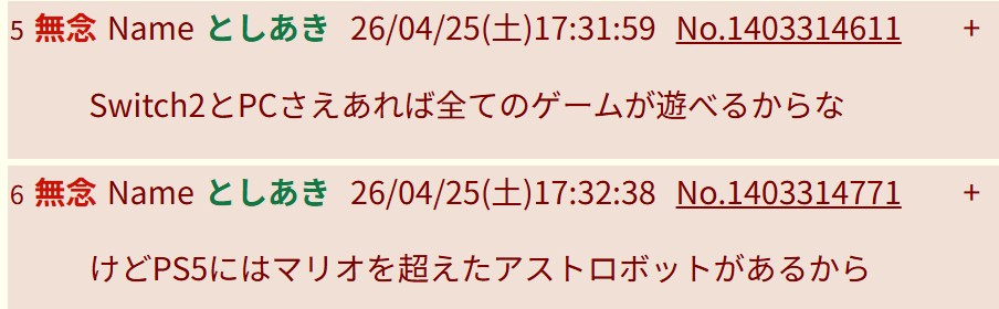 | … | 38無念Nameとしあき26/04/25(土)17:11:27No.1403310176そうだねx3今はTFスレに連レス荒らししてて忙しいみたいだよ |