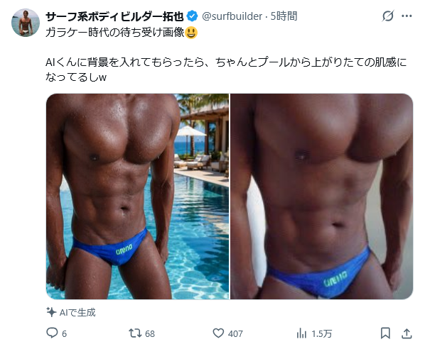 | … | 5無念Nameとしあき26/04/25(土)17:51:53No.1403319039そうだねx2頑張って鍛えたという自慢のガタイをなぜかAIで美化してキャッキャしてるジジイきらい |