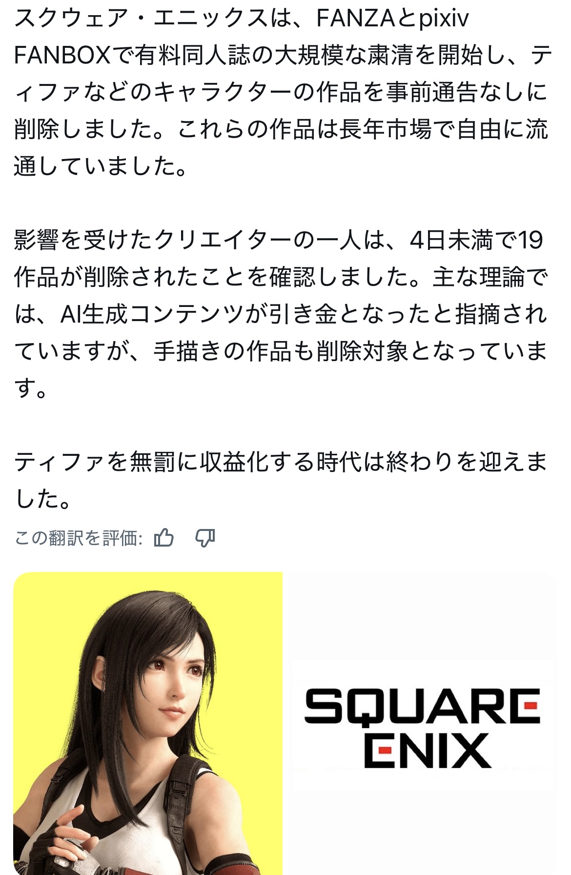 | … | 19無念Nameとしあき26/04/25(土)19:02:39No.1403336517+ティファなどのってことは他キャラも消されたのかな |