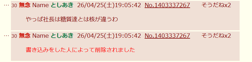 | … | 37無念Nameとしあき26/04/25(土)19:08:28No.1403337970そうだねx1>やっぱ社長は糖質達とは核が違うわ |