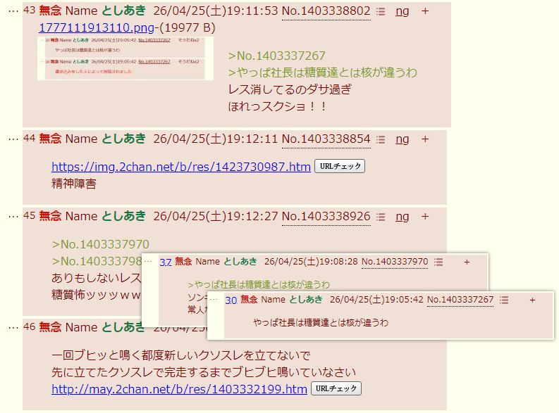 | … | 58無念Nameとしあき26/04/25(土)19:20:17No.1403340910+>また存在しないレス引用してるwww |