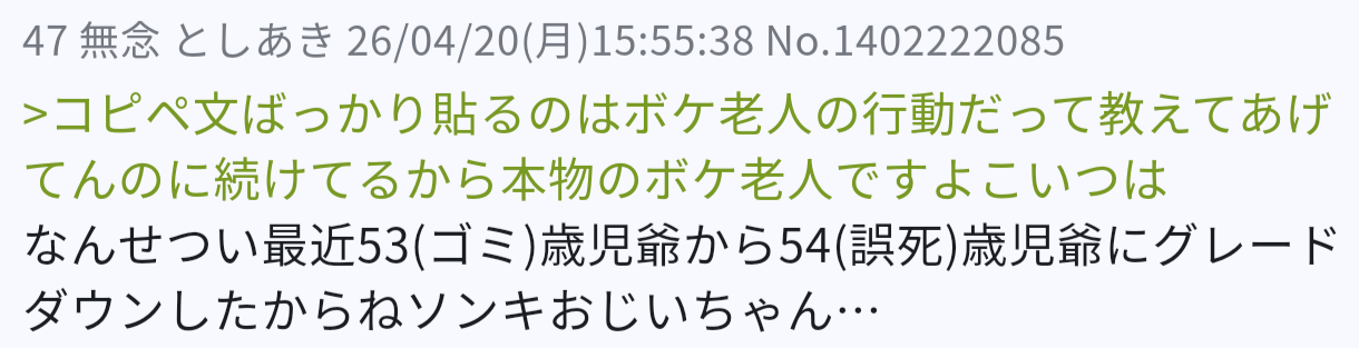 | … | 272無念Nameとしあき26/04/25(土)20:34:58No.1403362058+無様な自演をどれだけ続けても無駄なのによく飽きないよね?ソンキおじいちゃん… |