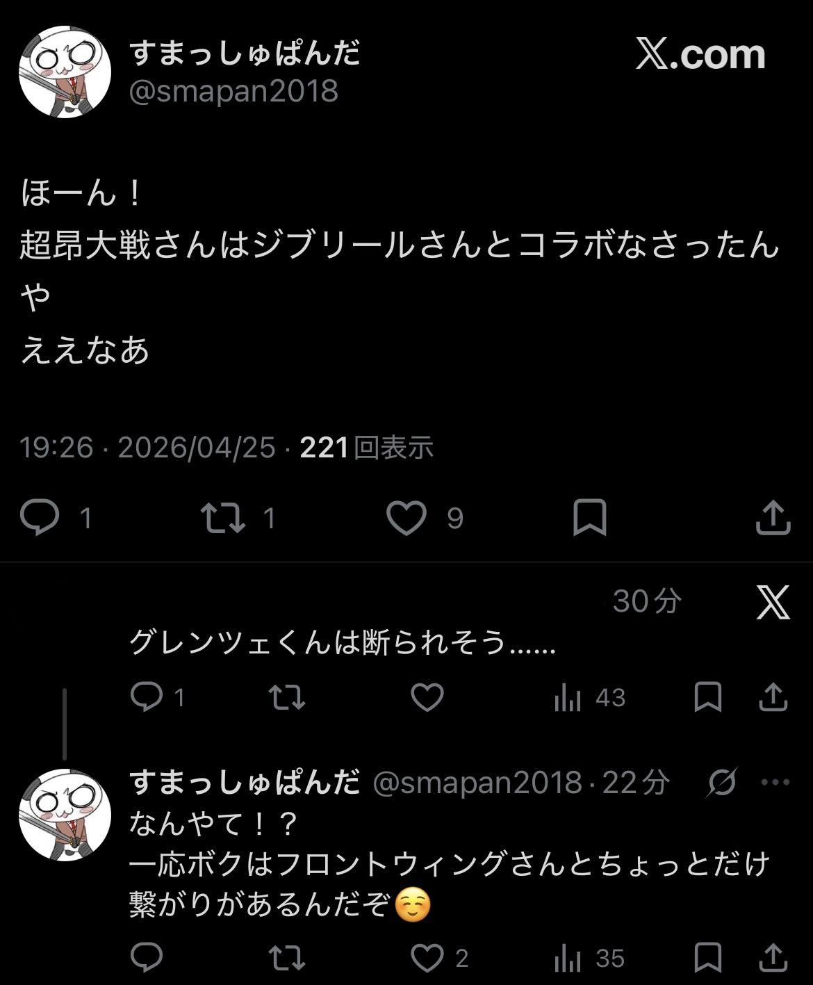 | … | 44無念Nameとしあき26/04/25(土)20:08:41No.1403354671+もうコラボ相手としてすまぱんの友達の友達くらいのだれかの縁とかあったりしないツァ? |