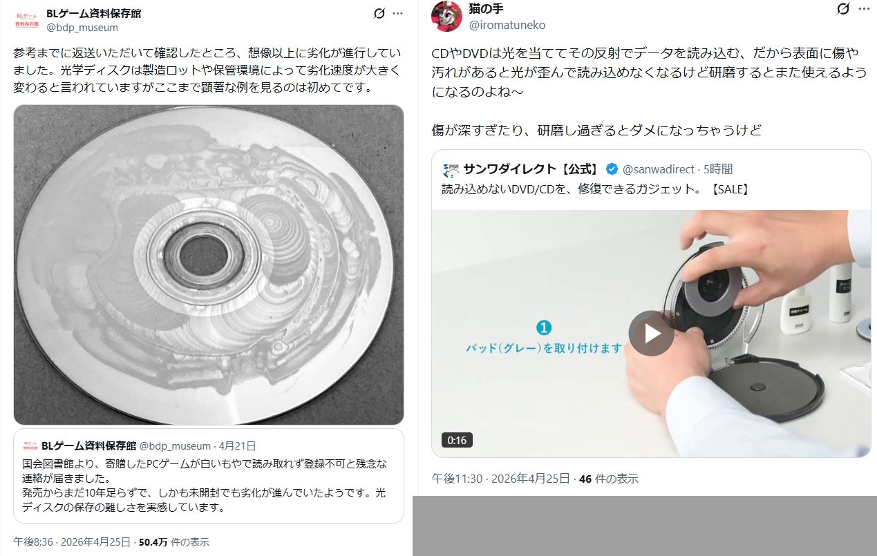 | … | 83無念Nameとしあき26/04/26(日)07:41:03No.1403452294+記録層の材料と厚さの選択と保存方法で全然変わる |