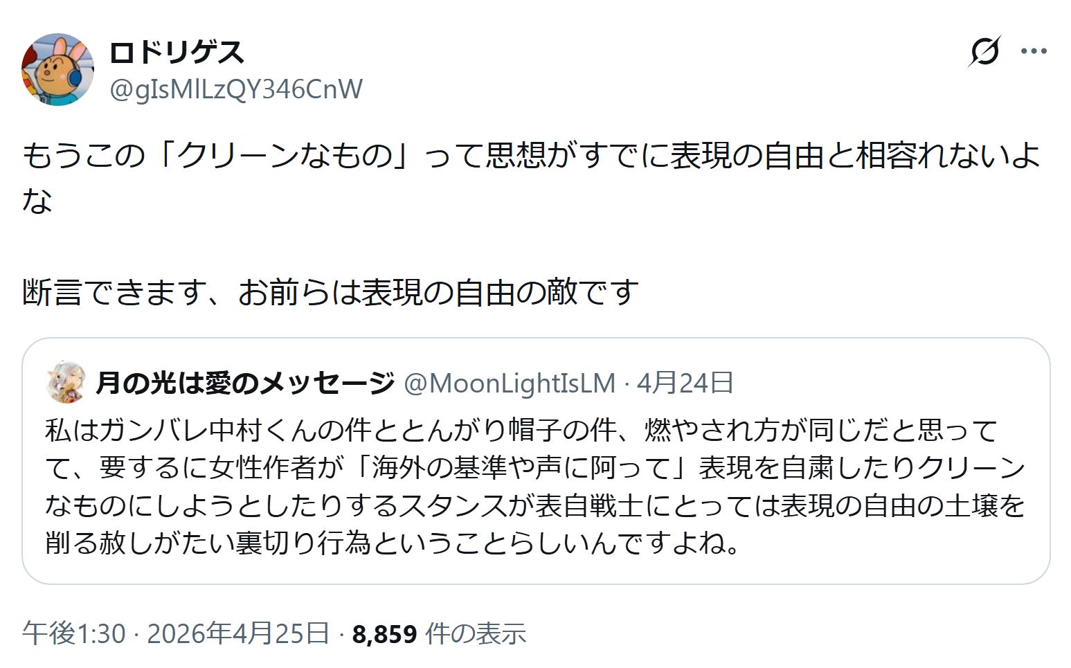 | … | 976無念Nameとしあき26/04/26(日)10:36:22No.1403484376+これを機に男も女も性的搾取創作をやめる方向に行けたらいいね |