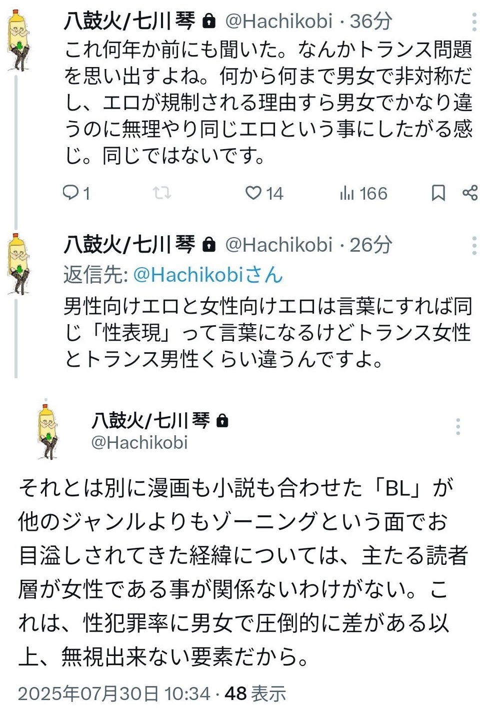 | … | 11無念Nameとしあき26/04/26(日)05:41:21No.1403445474そうだねx34頭のおかしな女どもの欲望でホモにされるキャラクターたちがかわいそうよ |