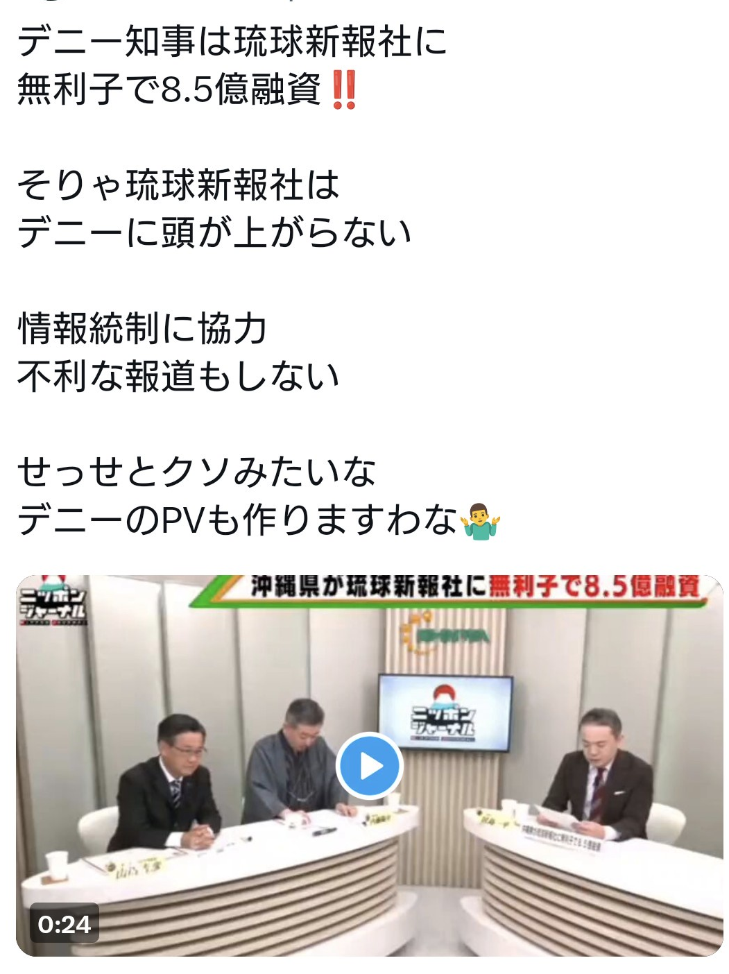 | … | 14無念Nameとしあき26/04/26(日)06:58:25No.1403449031そうだねx7まあでも琉球新報を政治家のデニーが牛耳っていること自体が法律違反なんだけど誰も訴えないから犯罪として立件できないからねぇ |