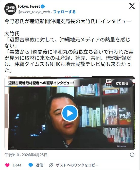 | … | 170無念Nameとしあき26/04/26(日)08:45:46No.1403461201+オールドメディアが云々ってあまり言いたくないけど各メディアの那覇支局が全然動いてないと産経の那覇支局記者のインタビューがあって |