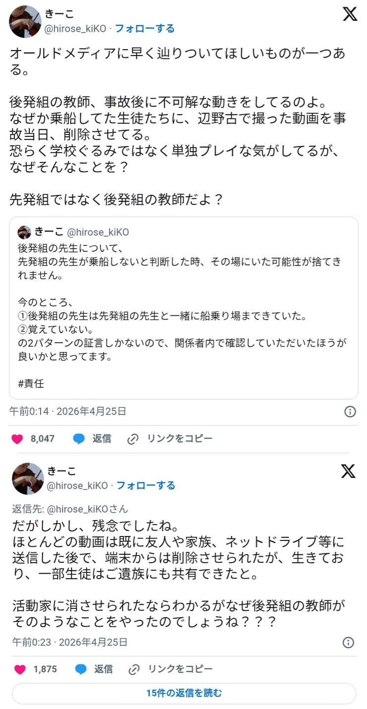 | … | 139無念Nameとしあき26/04/26(日)08:27:23No.1403457550+ 1777159643982.png-(759128 B) 遭難当日に現場で引率教師が生徒のスマホ動画を消去させた |