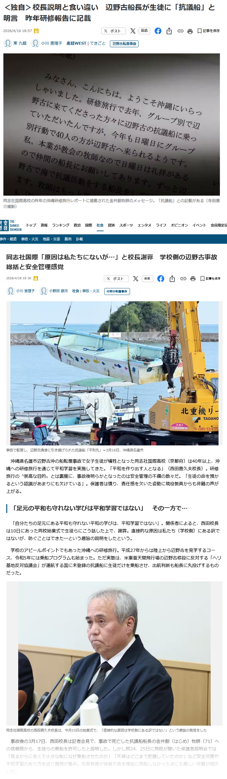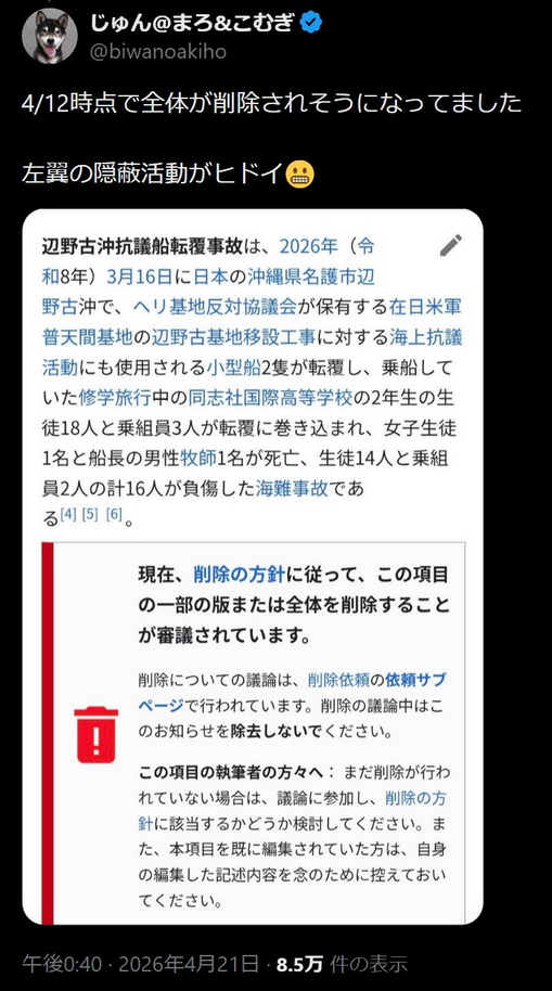 | … | 1無念Nameとしあき26/04/26(日)06:43:05No.1403448077そうだねx7選挙戦を左右しそうなのが、辺野古沖で船が転覆し平和学習中だった同志社国際高(京都府)の女子生徒らが死亡した事故だ。共産幹部は「沖縄では、ほとんど報道されていない」と話す |