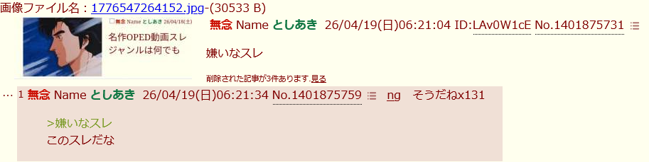 | … | 2無念Nameとしあき26/04/26(日)07:13:01No.1403450114そうだねx37>消えて欲しいスレ |