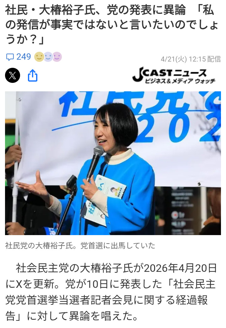 | … | 4無念Nameとしあき26/04/26(日)08:20:35No.1403456618+れいわが健在なら大椿はれいわにでも移ったんだろうけど |