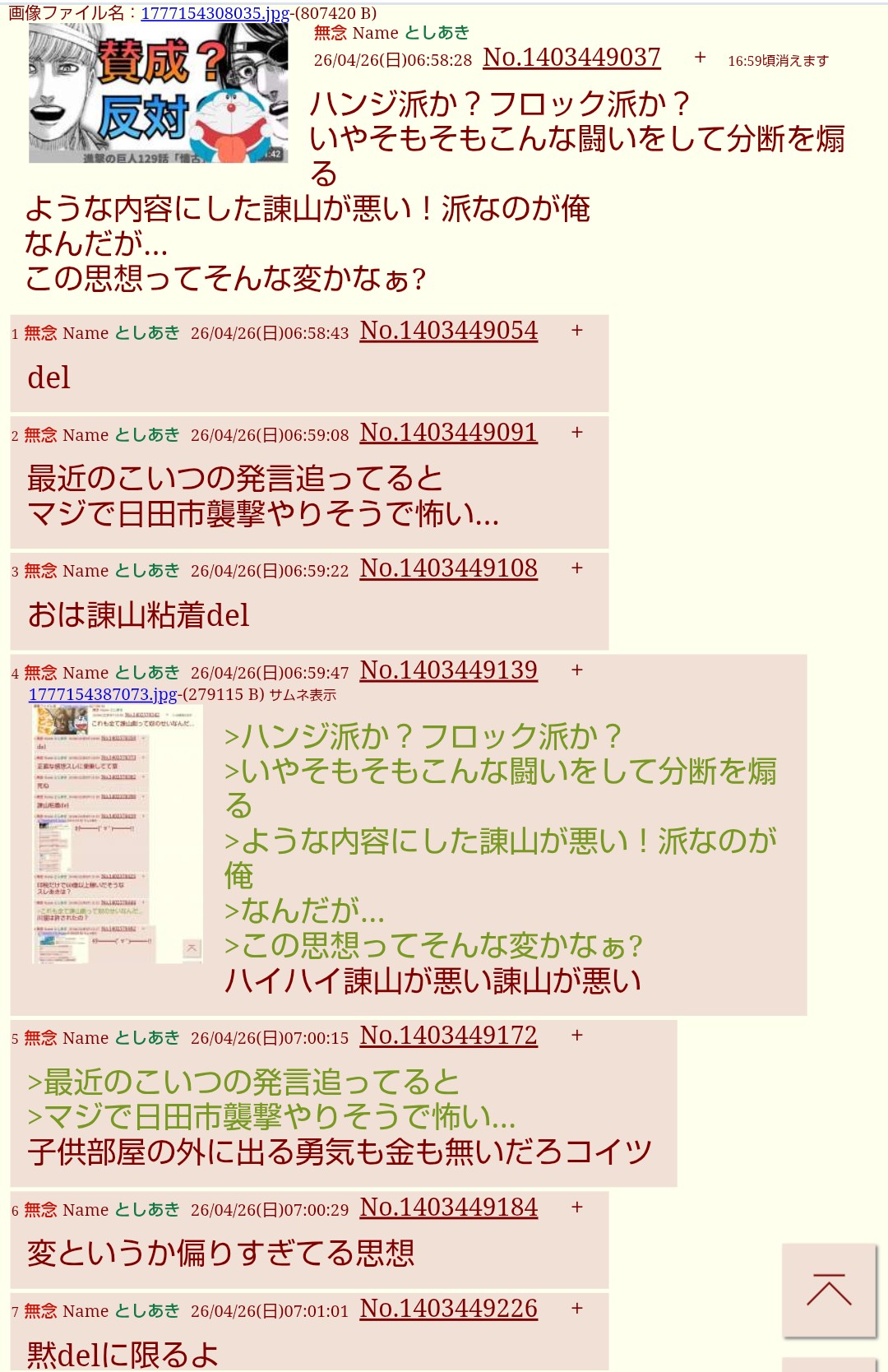 | … | 3無念Nameとしあき26/04/26(日)08:12:21No.1403455587+ 1777158741614.jpg-(258673 B) >Q進撃で一番嫌いなキャラは? |