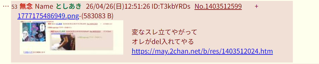 | … | 19無念Nameとしあき26/04/26(日)13:20:42 ID:viJ1g4IQNo.1403518803そうだねx3>https://may.2chan.net/b/res/1403501853.htm |