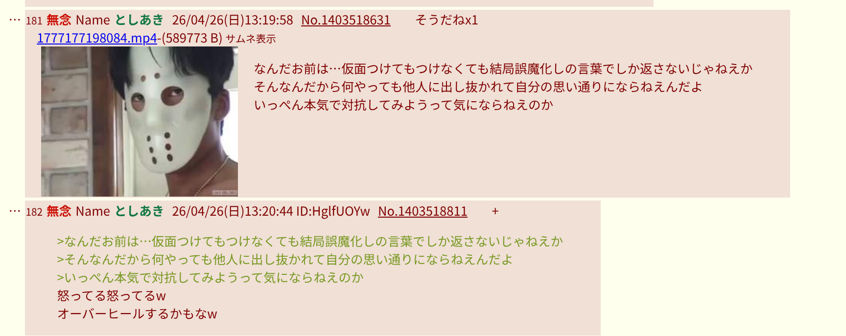 | … | 57無念Nameとしあき26/04/26(日)17:04:21 ID:fO09TuQUNo.1403570311そうだねx4仮面取れって言ったら実際に仮面を取って健全sage爺に応じるおフェラ座すき |